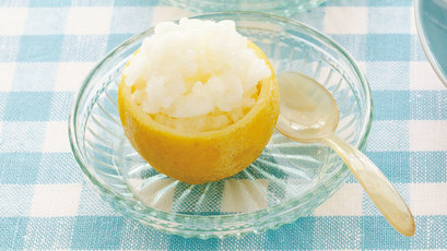 はちみつ味がやさしいレモンのシャーベット。皮を凍らせて器として使うので、見た目も楽しい!