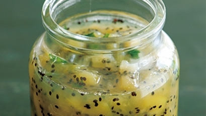 キウイの酸味とミントの香りが合わさった、すっきりと爽やかなシロップ。ミントのきれいな色を生かすため、キウイが冷めてから加えます。