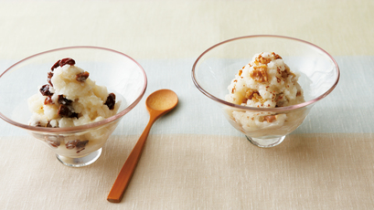 保存袋で冷やし固めて、手で砕くだけの手軽さがうれしい。しょうがのきいた大人味のシャーベットに、ドライフルーツやナッツを混ぜて食感も楽しめます。