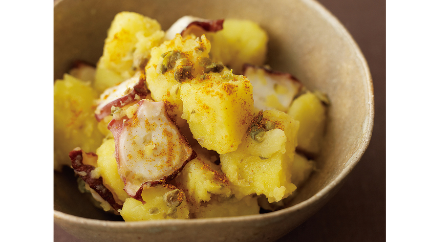 カレー粉入りの湯でじゃがいもをゆでると、黄金色がしみ込んで食感もホクホクに。たことの相性も抜群の、新感覚のポテトサラダですよ。