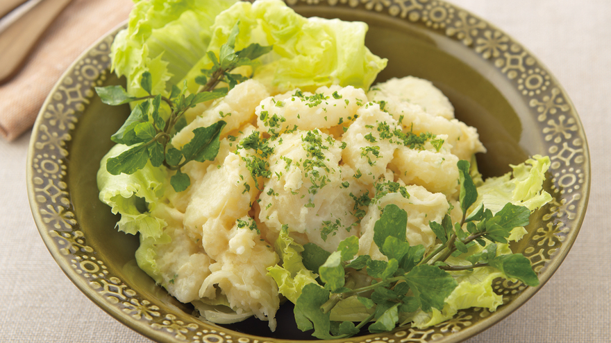 おいしいポテトサラダになる秘けつは、じゃがいもにフレンチドレッシングの下味をしっかりなじませることですよ。