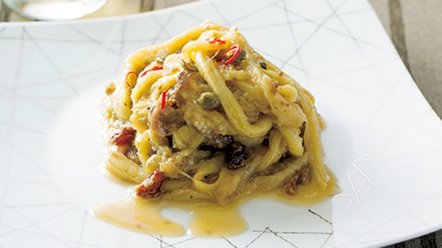 うまみたっぷりのマリネ液に香ばしく焼き上げたなすをつけ込みました。ケイパーやレーズンがアクセント。白ワインと合わせると最高の一品です。