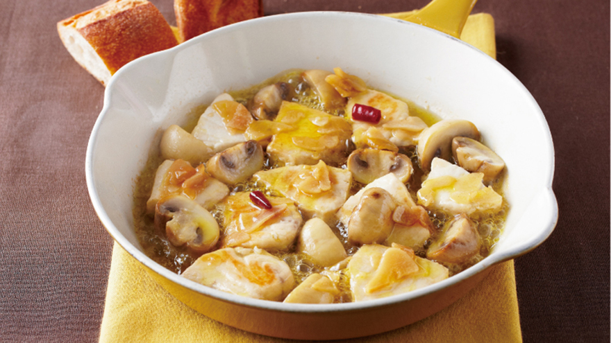 アヒージョとはにんにくとオリーブ油で煮込むスペイン料理のことです。淡泊なかじきをパンチのある一品に。残った油をパンに吸わせて食べると2度おいしい!