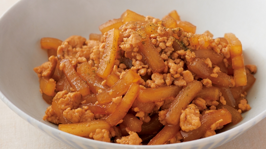 ひき肉のコクが出た煮汁を春雨に吸わせて、プルンと食感よく仕上げます。柚子(ゆず)こしょうが味のメリハリに。ご飯にのせて食べてもおいしい!