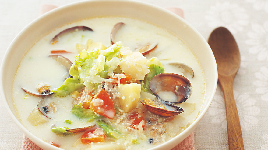 あさりのうまみがたっぷりのクラムチャウダーに、みずみずしい春キャベツをプラス。