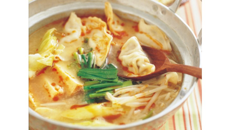 ごま味に豆板醤、ラーユを加えたピリ辛鍋。冷凍ギョーザで手軽につくれる一品です。