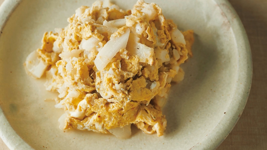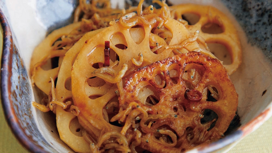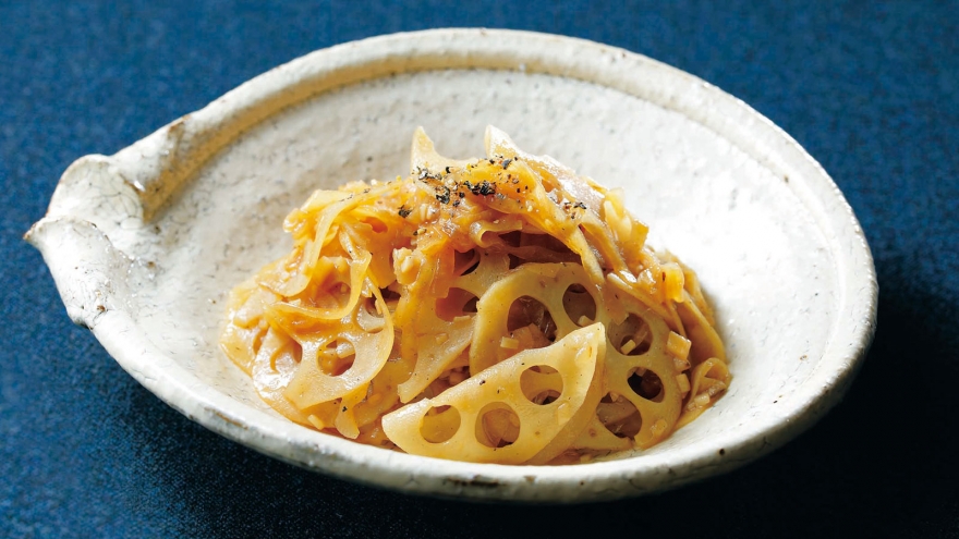 れんこんは薄い輪切りにし、シャキシャキ感を楽しみます。じっくり炒めたたまねぎの甘みと、みじん切りにしたエリンギがれんこんにからみ、コクとうまみが口いっぱいに広がります。