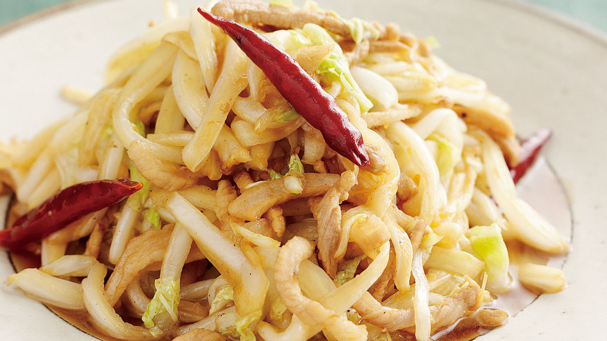 とうがらしの辛みと、黒酢の酸味がきいたコクのある炒め物。白菜の軸に塩をふって水分を抜いておくことがポイントです。