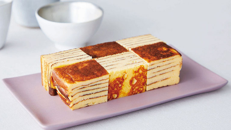 卵焼き器で焼いた生地をどんどん重ねてつくる、しっとり食感のだて巻き。大きな生地を巻くときに割れたりすることもなく、好きな形に切れるので、盛りやすいのもうれしい!
