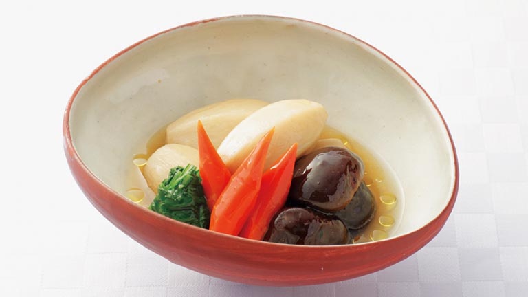 根菜の力強い香りと、春菊とオリーブ油の清涼感。「香り」を生かした、ひと味違う正月料理です。しいたけは「丸」、里芋は「亀甲」、にんじんは「のし」、それぞれ縁起のよい華やかな形に切り、新春を表現します。