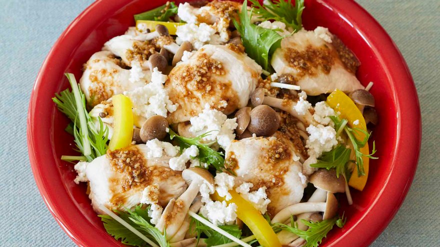 高たんぱく低脂質の鶏むね肉が主役の、主菜になるサラダ。鶏むね肉は驚くほどしっとりとなめらか! ドレッシングはノンオイルで、仕上げに低脂肪のカッテージチーズをトッピングして満足感をアップ。