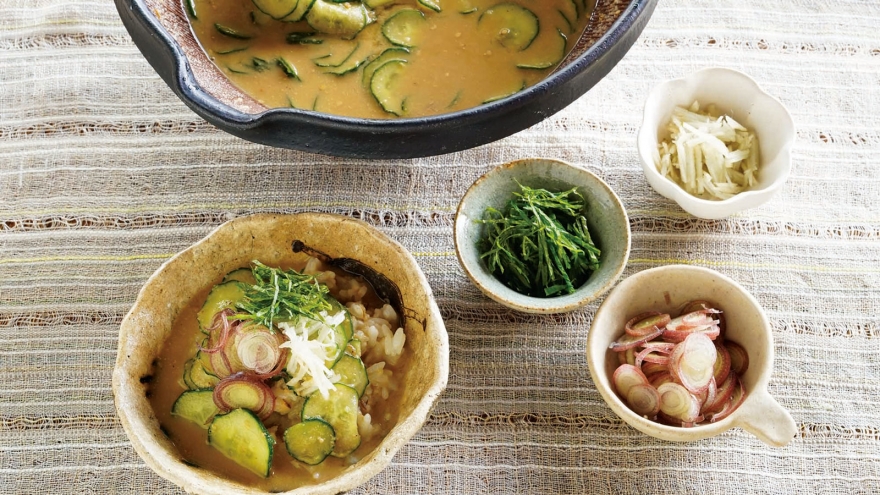 みそ汁に干物や野菜を加えた簡単冷や汁。みそ汁はキンキンに冷やすのがポイントです。