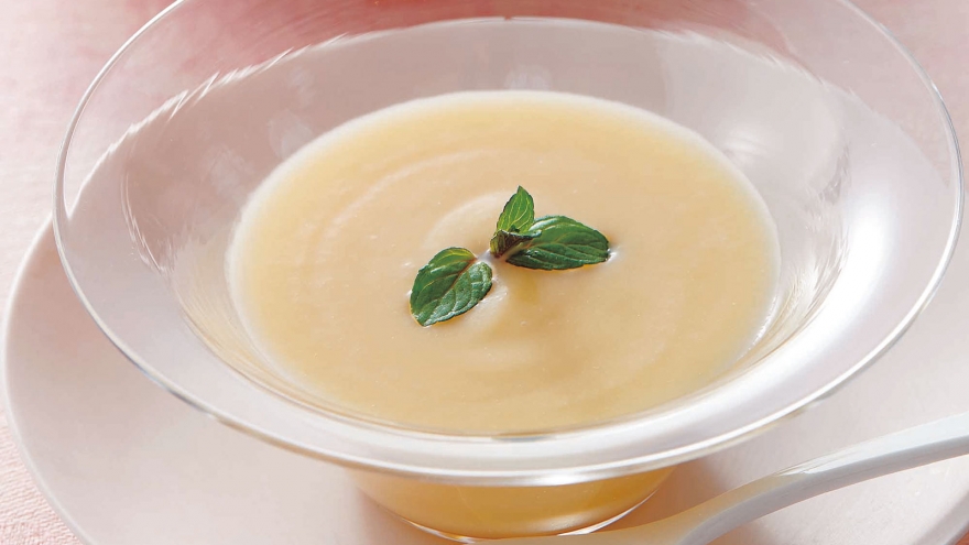 じゃがいもの冷たいスープ、ビシソワーズに長芋をプラス。サラッとしたのどごしのあとに口に残る長芋のヌルリとした独特の食感が、うにと好相性です。