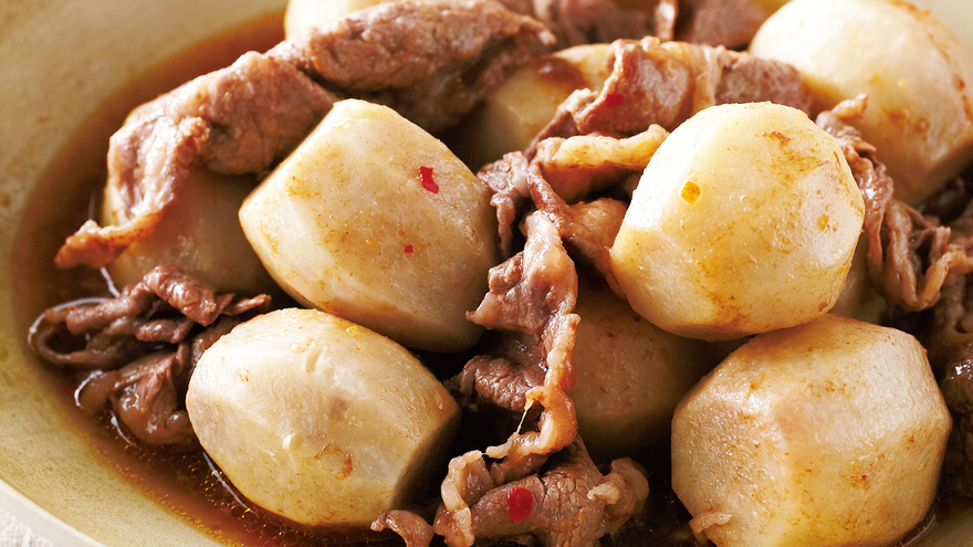 里芋を炒めてコクを出し、牛肉でうまみをプラスします。こっくり味がおいしい中国風煮物です。