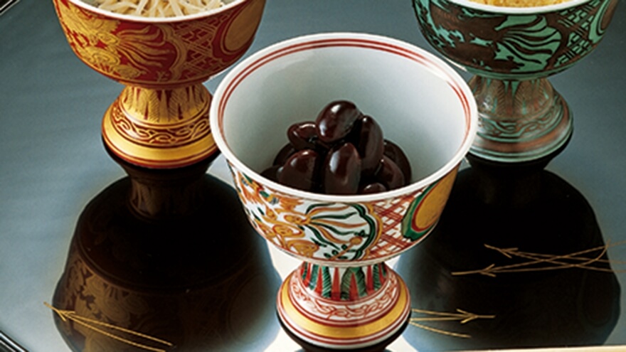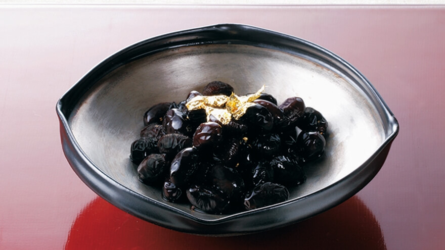 おせち料理に欠かせない黒豆。ふっくらつややかに仕上げて、華やかな器に盛ります。