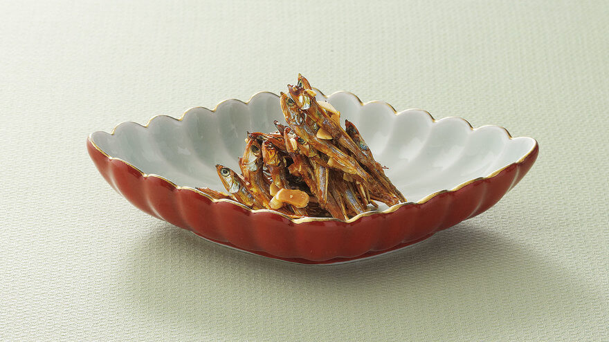 豊作を祈る祝い肴(ざかな)である「田作り」を簡単に。頭をそろえ、きれいに盛りつけて「家族」を表現します。