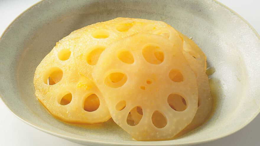 みかんの搾り汁でれんこんを薄い黄色に色づけます。さっぱりとした風味は、おせちの箸休めに最適。