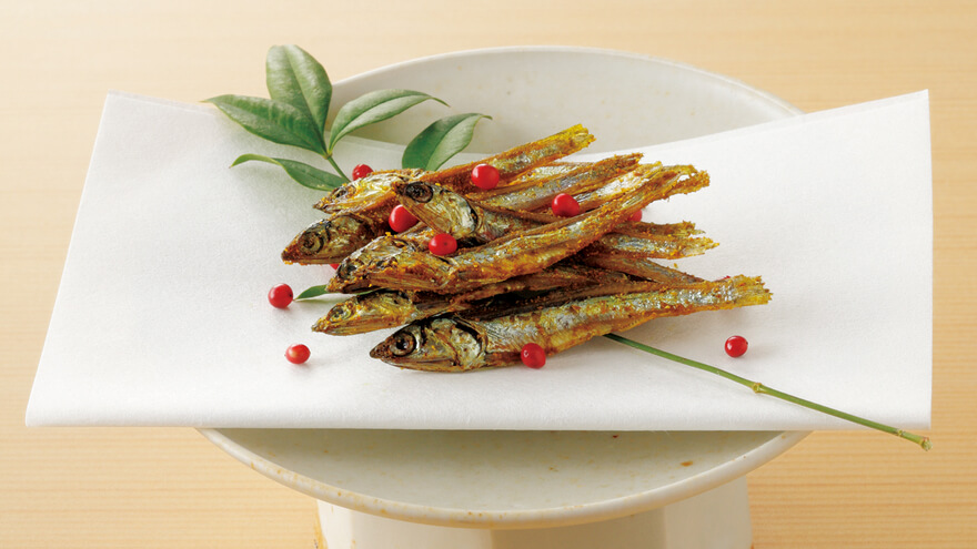 お正月のごまめには、今年も「まめまめしく」働けるように、という願いが込められています。パリッと揚げた「揚げごまめ」は、ついつい手がのびるおいしさが魅力。伝統を踏まえてアレンジされた、現代的な祝い肴(ざかな)をどうぞ。