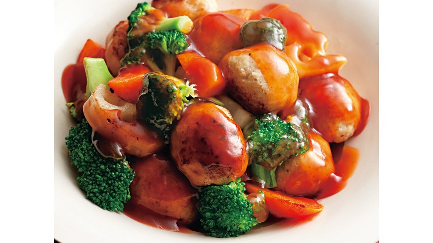 フワフワのえびとシャキシャキのもやしが楽しめる新食感の一品です。ベーコンのうまみがきいた上品なあんが、やさしい味のえびだんごにぴったりですよ。
