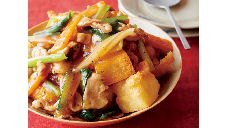 ヤミーさんがベトナムで出合った、揚げたフォーのあんかけに着想を得たという至高の一品。カラッと揚げたもちに肉野菜のあんがからんで、立派なメインおかずになります。