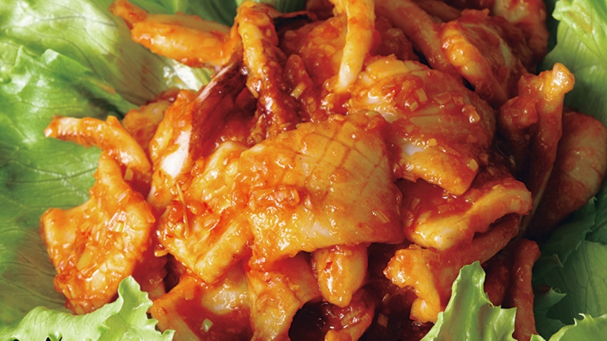 人気の定番、えびチリのいかバージョン。皮をむいて切り目を入れることで、チリソースがからみやすい一品です。