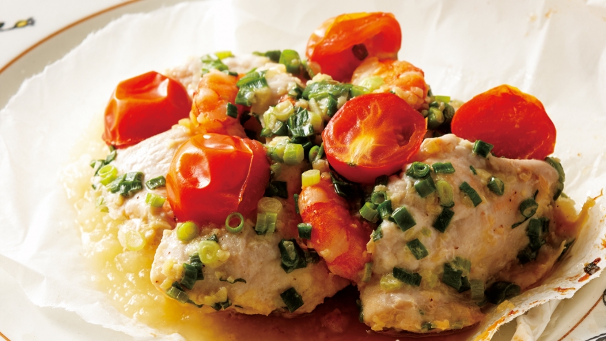 パサつきやすい鶏むね肉も、マリネして包み焼きにすれば、ふっくらジューシーに。しょうがや細ねぎの香りも逃がしません。素材やマリネ液のうまみを吸ったじゃがいももおいしい!