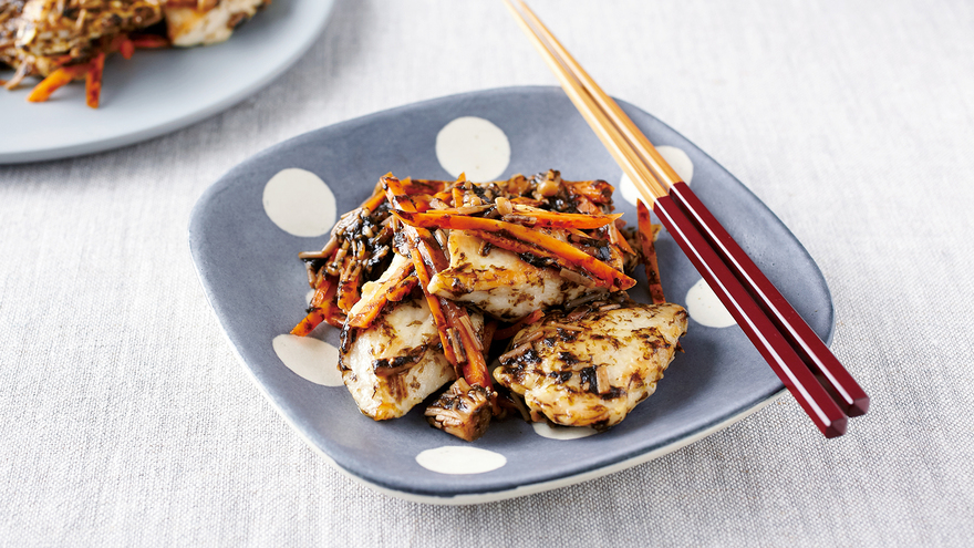 パサつきがちな鶏むね肉も、和風真っ黒だれのとろみでしっとりとした仕上がりになります。にんじんで彩りと食感に変化をつけて。