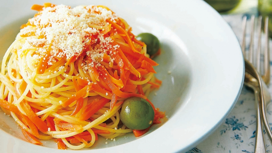 柔らかくてみずみずしい春にんじんをたっぷり使って、スパゲッティはいつもより少なめだからヘルシー!にんじんの甘みと、オリーブ、粉チーズの塩けのバランスが絶妙で、ペロリと食べられちゃいます。
