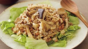 すぐにできる料理で、おすすめなのは納豆チャーハンです。ひき肉を炒めて、もち麦入りのご飯、納豆にしょうゆと砂糖を混ぜたものをサッと混ぜる。発酵食品の納豆が調味料代わりになります。ぜひサラダ菜も添えて。