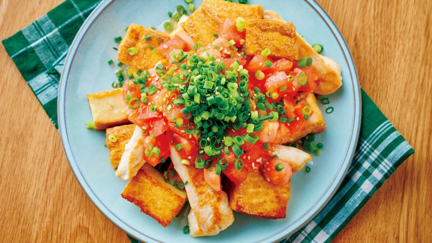 手ごろなイメージのある2つの食材もこんがり焼いて彩りのよいたれをかければ、豪華な一皿に変身!トマトから水けが出るので、たれは食べる直前にかけて。