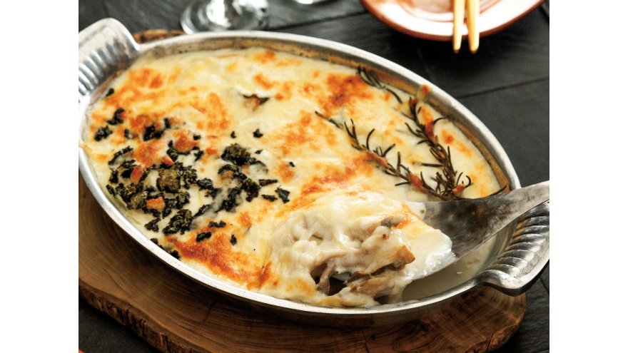 きのこ、鶏ささ身、かき、かぼちゃの4つのパートからなる画期的なグラタン。それぞれのうまみがしみ出たホワイトソースの食べ比べもお楽しみ。隣どうしの味を混ぜてもおいしい!