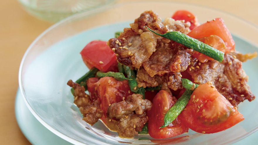 さっぱりしていながら食べごたえのあるおかずサラダをご紹介。カリッと香ばしい豚肉とフレッシュなトマトを合わせたジューシーなおいしさです。