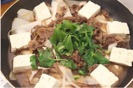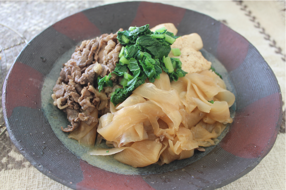 「まず牛肉を焼いて、砂糖をからめておくこともポイントです。それからひらひらにした大根を牛肉の下に入れ込んで煮ます。」