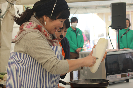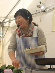 クッキングステージには、エダモンの愛称でおなじみの枝元なほみさんが登場! 地元生産者の鈴木さん夫妻が生産した大根を使って、「ひらひら大根のすき焼き風」(美肌レシピ)と直売所のほうれんそうで「ほうれんそうのキッシュ」(骨強化レシピ)を披露しました。