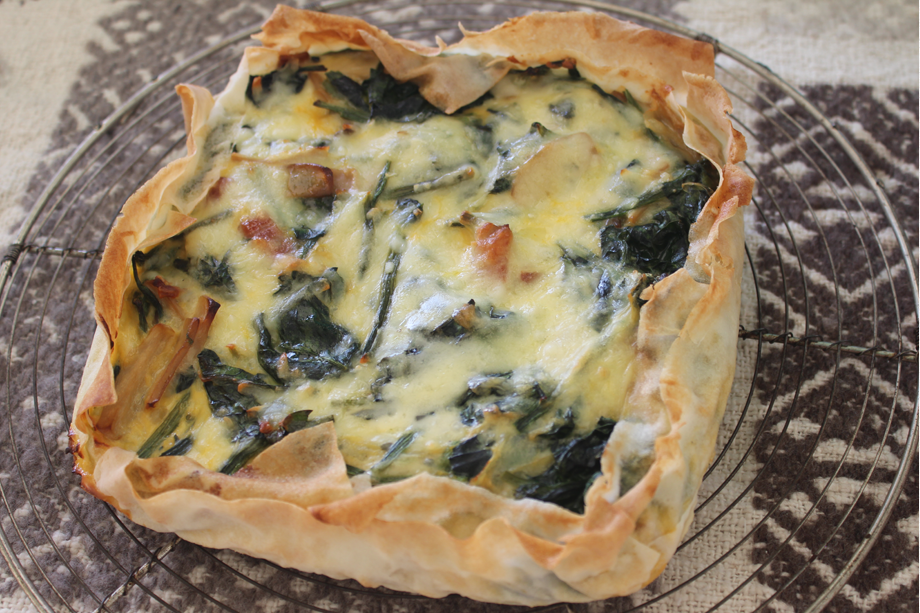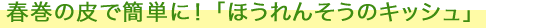 「キッシュはむずかしそうと思うかもしれませんが、意外と簡単!今回は、春巻の皮を 使います。2~3枚、卵液を塗りながら均等に耐熱皿に敷きこんでいきます。卵を塗るとふんわりするんですよ。残った皮は、冷凍庫に入れて保存してくださいね。」