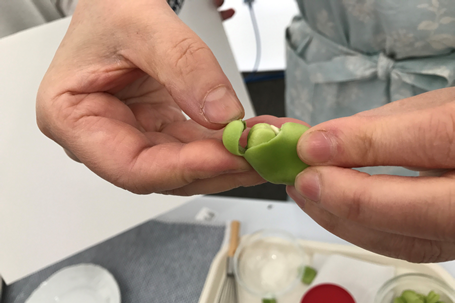 「まず、そらまめをさやから上手に出して、皮をむきましょう。