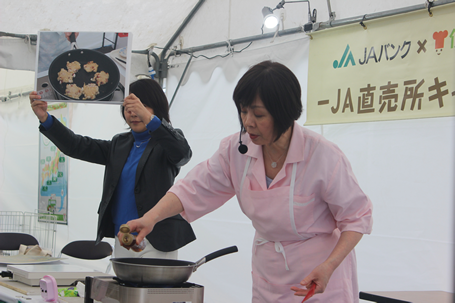 クッキングステージでは、料理研究家の脇雅世さんが、指宿市の生産者水迫智弘さんが栽培したそらまめを使った「そらまめのフリット」と「新ばれいしょとタコのおやき」のつくり方を紹介しました。
