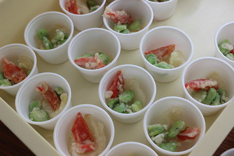 指宿の水迫智弘さんが生産したそらまめを使って「そらまめのフリット」がつくられ、来場者にふるまわれました。「そらまめが香り良く、さっくり揚がっている!」「炭酸水で小麦粉を溶くのは初めて」と大好評♪