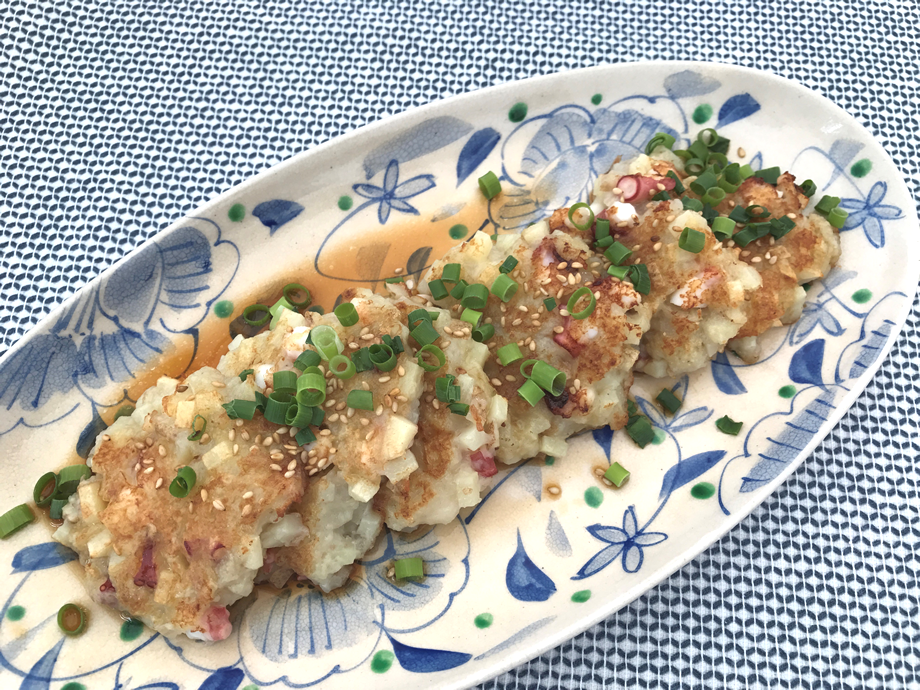 「これから新ばれいしょが出回る季節になりますね。水分が多くておいしいので、すりおろしておやきにしました。新ばれいしょの半分は、角切りにしてタコと混ぜて焼くと違った食感が楽しめます。」