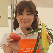小島さん夫妻は、安曇野市三郷でコシヒカリの稲作をし、畑で15品目の野菜を育てています。クッキングステージで使うトマトととうもろこしは小島さんがつくりました。