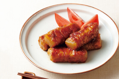 薄切り肉をこんにゃくに巻きつけてボリュームアップ。ご飯がすすむしょうが焼きにします。プルンとしたこんにゃくの食感も魅力です。