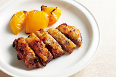 厚みのある肉は、常温に戻して火を通りやすくするのがポイント。にんにく入りのみそを塗って香ばしく焼き上げます。