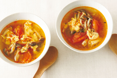 「酸辣湯」と書き、酸味とピリ辛が特徴の中華スープです。トマトを皮ごと煮込むとうまみアップ。ふんわり卵で魅力が倍増します。