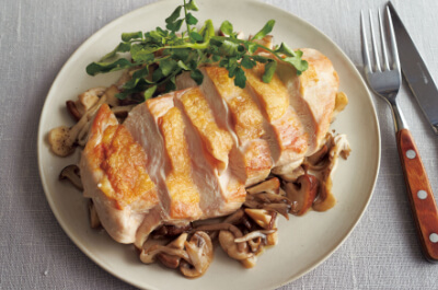 香ばしく焼けた皮としっとりした肉の食感に感動!香りのよいきのこのソテーを添えた、おもてなしにもピッタリの一皿です。