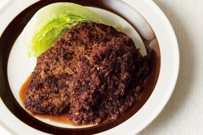 肉の食感がしっかり感じられる、まるでステーキのようなハンバーグです。にんにくが香る和風ソースは、ご飯にもよく合います。