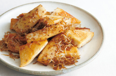 長芋を皮付きのままこんがりと調理。バターとしょうゆで風味よく炒めます。はんぺんやじゃことの食感の違いも魅力です。