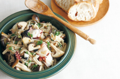 ふたをして蒸すと山盛りのきのこがしんなり。ふっくらとして程よい歯ごたえが残ります。パンにのせたり、パスタにからめたりするのもおすすめです。