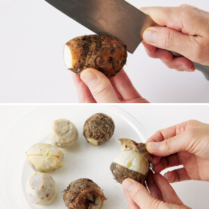 里芋は上下の端を切り落とし、縦に1本切り目を入れる。耐熱皿に入れてふんわりとラップをし、電子レンジ(600W)に約5分間かける。里芋を返し、再びふんわりとラップをして電子レンジに約3分間かける。竹串を刺してスーッと通ったら取り出す。堅いときはさらに約1分間かける。粗熱が取れたら手で皮をむく。