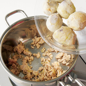 小さめの鍋にごま油大さじ1とひき肉、しょうがを入れて弱めの中火にかけ、肉をほぐしながら2~3分間炒める。1の里芋、【A】を加える。