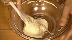 2. 1に65gの強力粉を入れ、へらでダマが無くなるまで混ぜる。ラップをして20~28℃で40分間発酵させる。